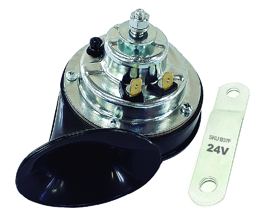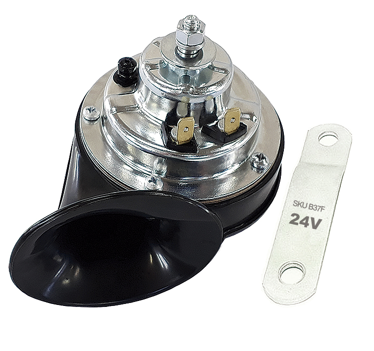 Buzina modelo 1 tom | Sem relê | Suporte de fixação modelo universal | Alojamento de aço zinco cromado | Ligação para 2 terminais, positivo e negativo modelo Faston 6.3 universal