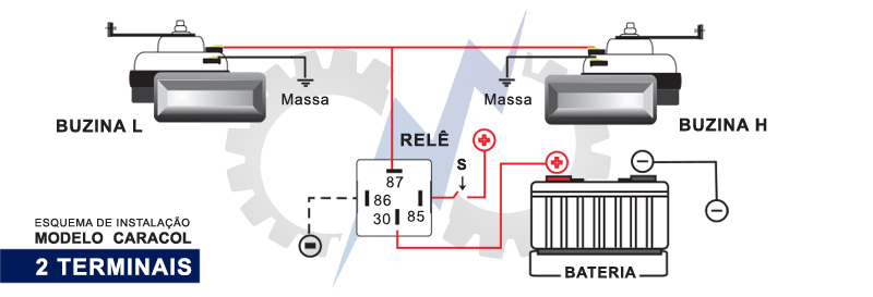 Posicione a buzina de modo que o caracol fique protegido contra a penetração de água de chuva ou lavagem de motor. É imprescindível contato perfeito entre as buzinas e a massa negativa.