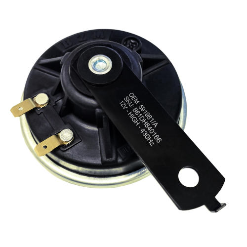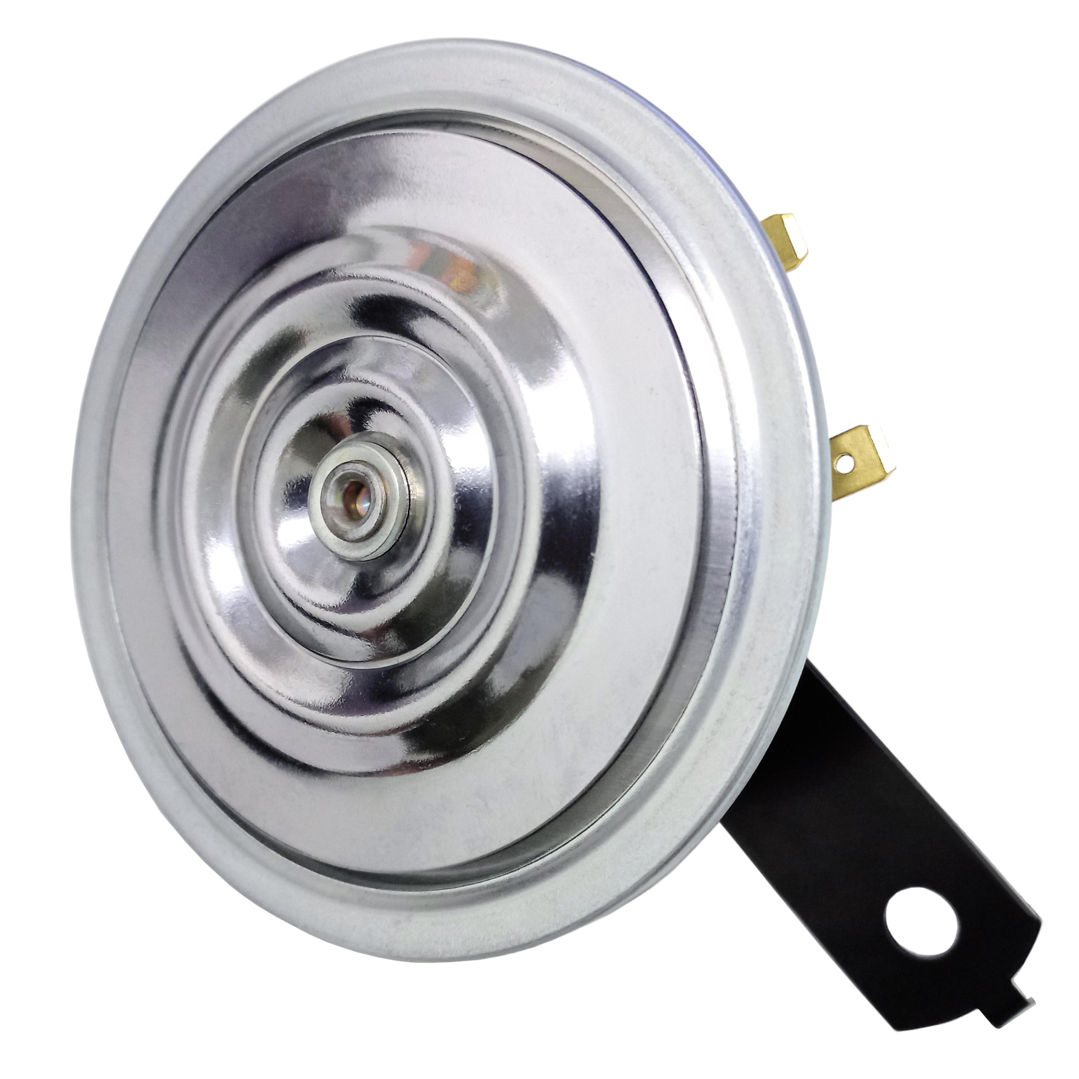 Buzina modelo 1 tom Agudo - Ø97mm | Sem relê | Acompanha suporte de fixação modelo original | Alojamento de Nylon com alma de aço | revestimento KTL preto | Badalo cromado | Ligação para 2 terminais, positivo e negativo modelo Faston 6.3 universal - ALTA SONORIDADE PARA MOTOS ROYAL ENFIELD - VEICULOS EM GERAL - USO UNIVERSAL