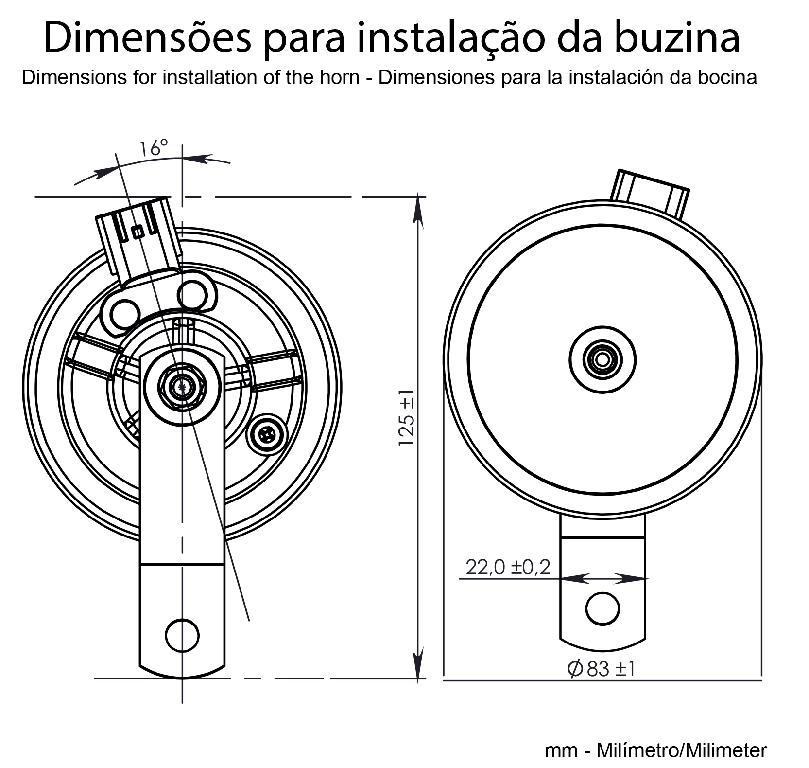 Posicione a buzina de modo que o prato ressoador (disco) fique virado para frente, isso melhora a propagação das ondas sonoras. NUNCA remova ou enrole as lâminas do suporte de fixação da buzina, isso implicará na regulagem da buzina, podendo alterar sua funcionalidade e invalidar a garantia.