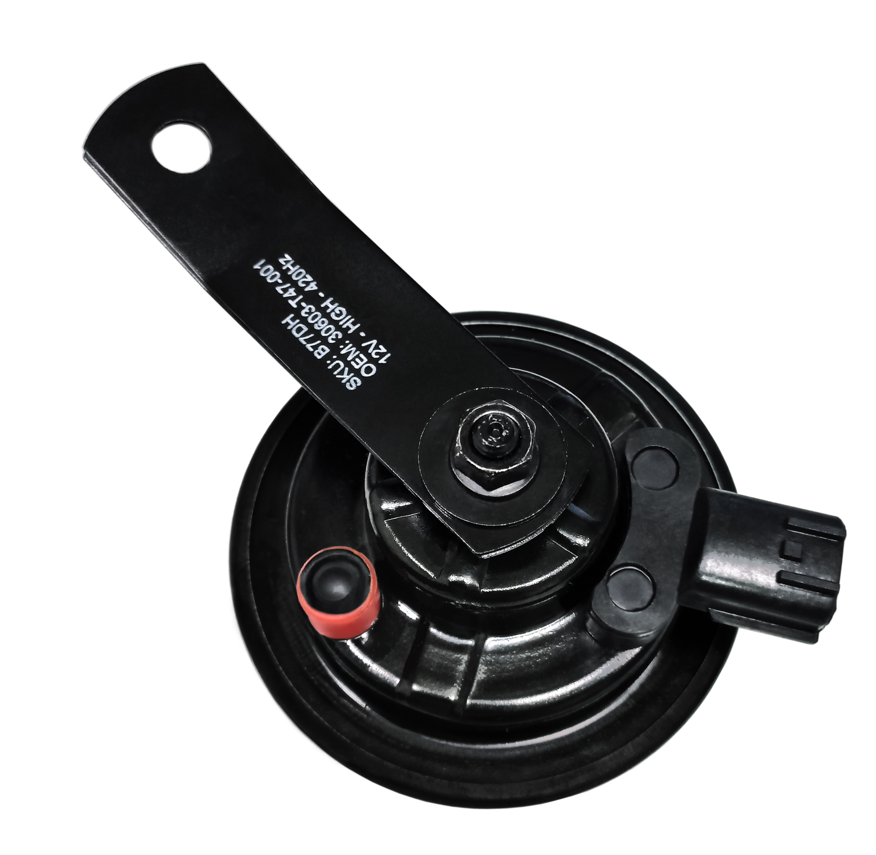 Buzina modelo motos, 1 tom agudo - Ø83mm | Sem relê | Acompanha suporte de fixação modelo original | Alojamento de aço revestimento KTL preto | Conector modelo MOLEX - ALTA SONORIDADE PARA MOTOS DAFRA SYMM