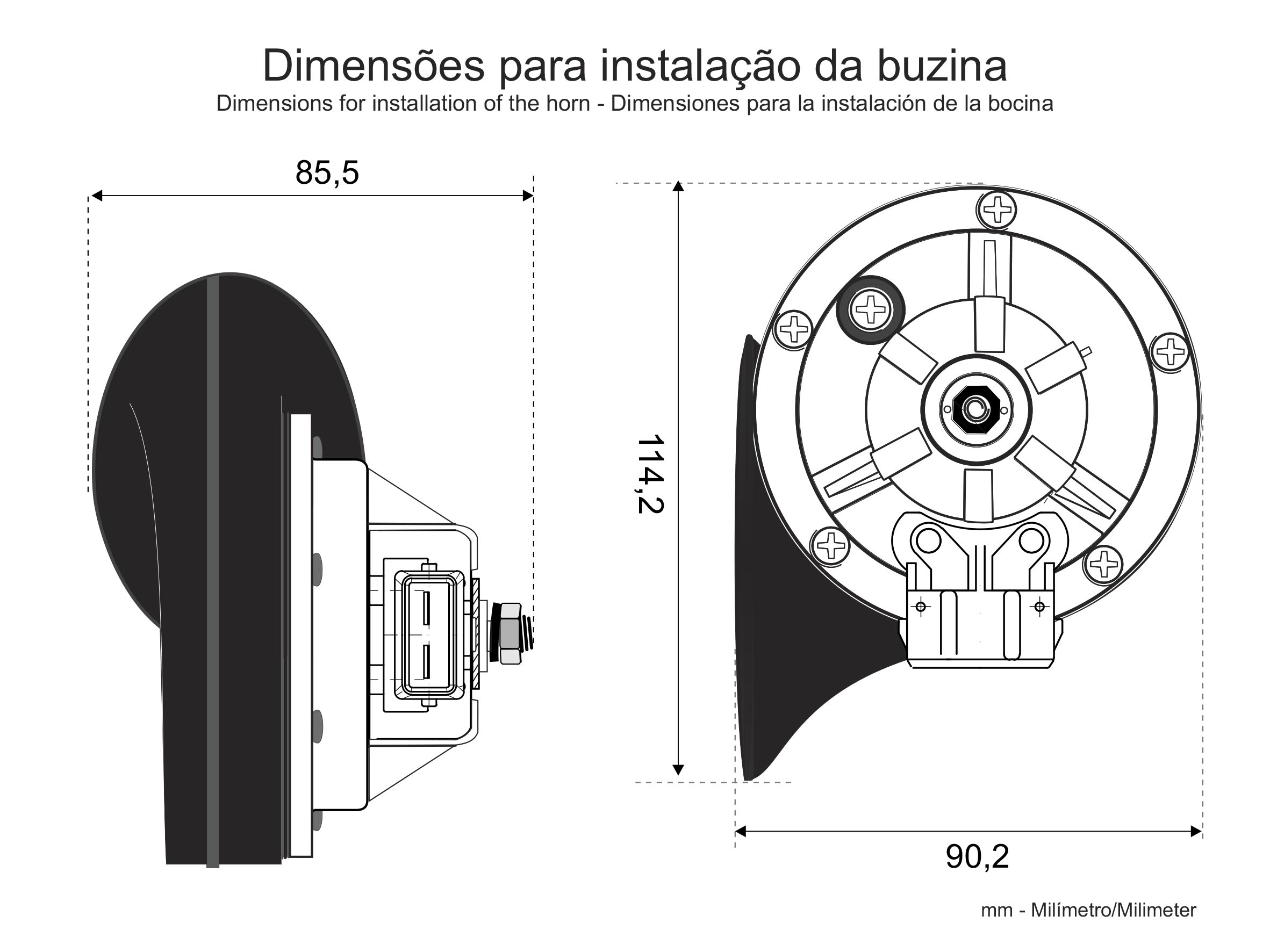 Para uma boa instalação do modelo buzina CARACOL, são necessários alguns cuidados na hora da instalação. Instale a buzina na carroceria de forma que evite vibrações danosas ao conjunto.