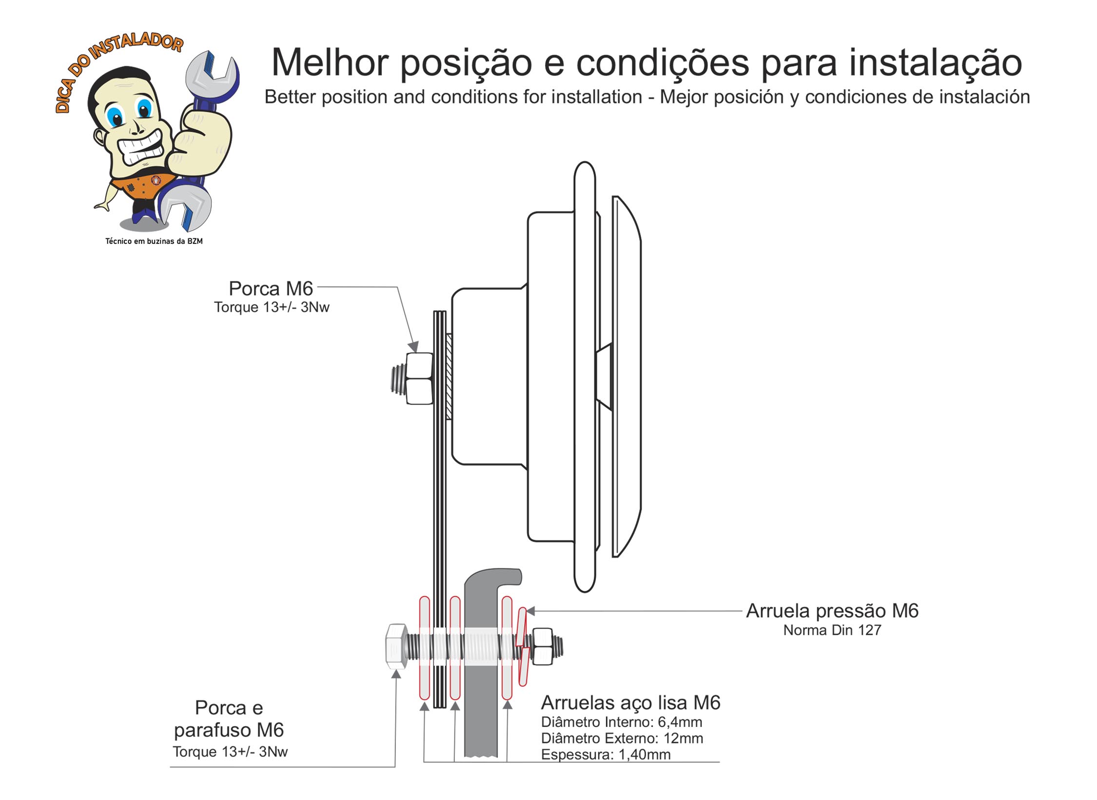 Para uma boa instalação do modelo buzina PERCUSSÃO, são necessários alguns cuidados na hora da instalação. Instale a buzina na carroceria de forma que evite vibrações danosas ao conjunto.
